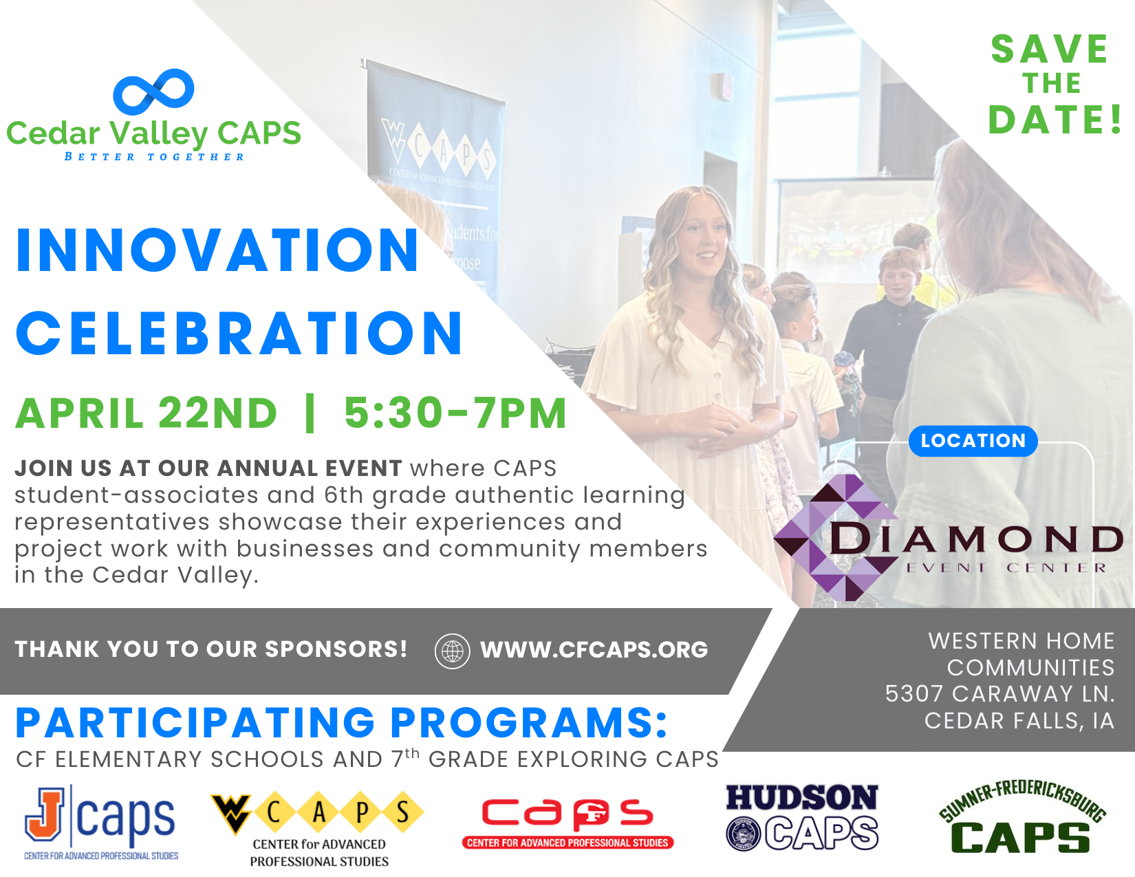 Cedar Valley CAPS hosts an annual Innovation Celebration in April during the Spring Semester. This annual event offers the high school programs involved in the Cedar Valley Centers for Advanced Professional Studies (CAPS) an opportunity to showcase the experiences of the student-associates and their project work with local businesses and community members. The event also highlights the work from 6th grade Authentic Learning students from local participating elementary schools and from the 7th grade Exploring CAPS programs from local participating junior highs.